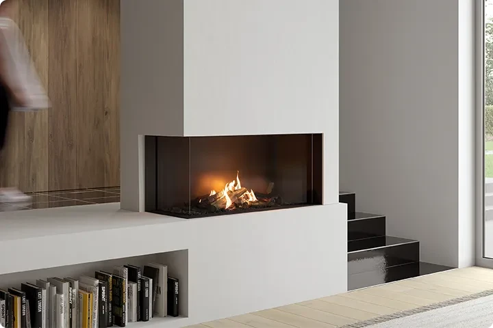 En hjørne gaspejs med to glassider giver et fantastisk udsyn til flammerne fra flere vinkler og er en populær løsning til at udnytte rummet optimalt. Pejsen kan fx placeres, så den både kan ses fra stue og spisestue samtidig.