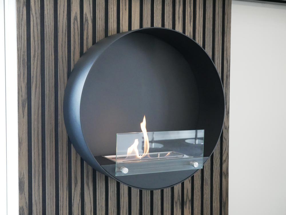 Alle vores væghængte biopejse har en varmeisolerende bagplade eller et vægbeslag, der skaber et lille mellemrum mellem væg og pejs. Alle vores væghængte biopejse vil derfor kunne fungere sammen med træpanelerne fra i-Wood.