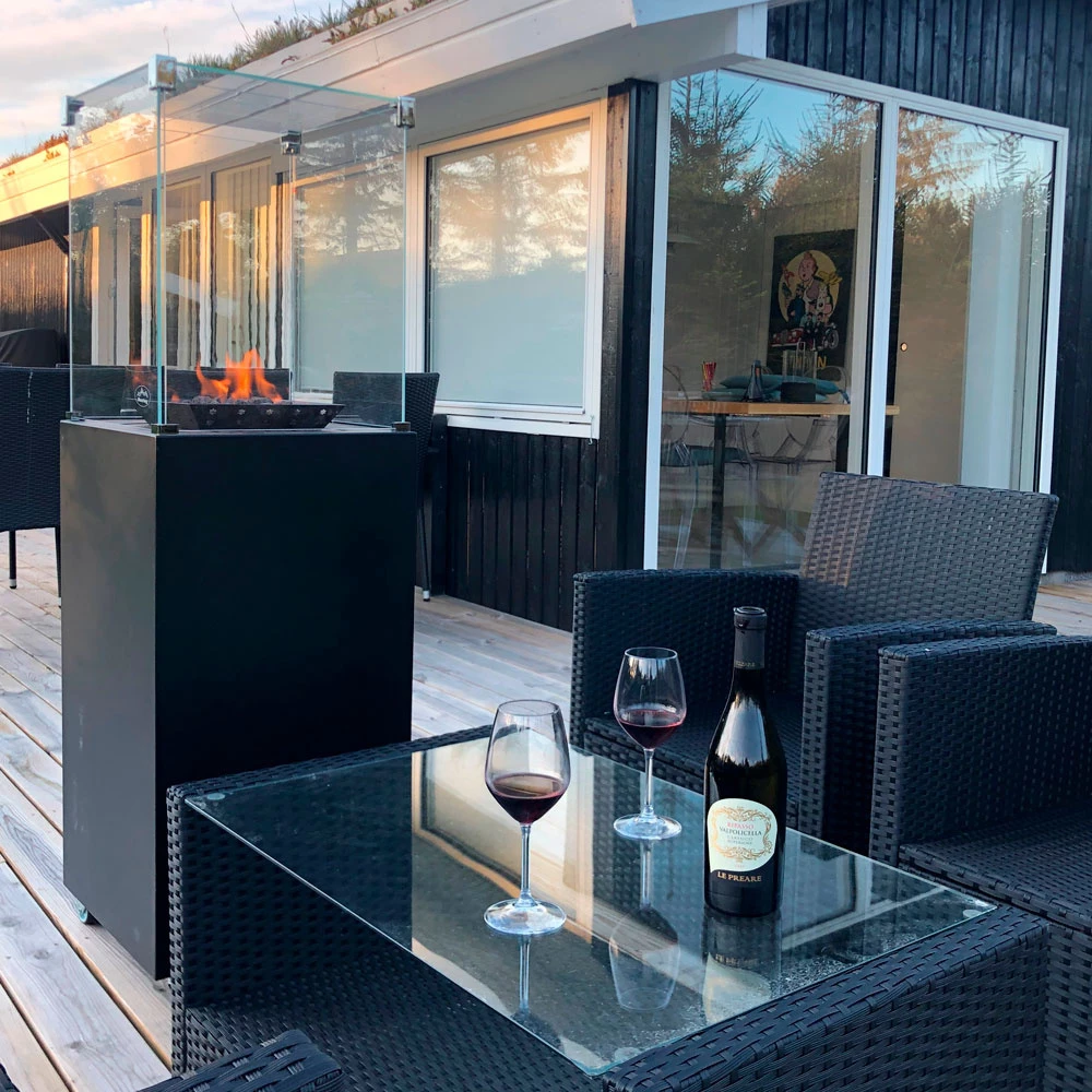 Inspiration til udemiljøer med udendørs gas terrassevarmere, som både giver varme og en flot synlig flamme, når mørket står på.