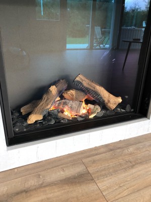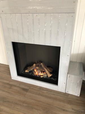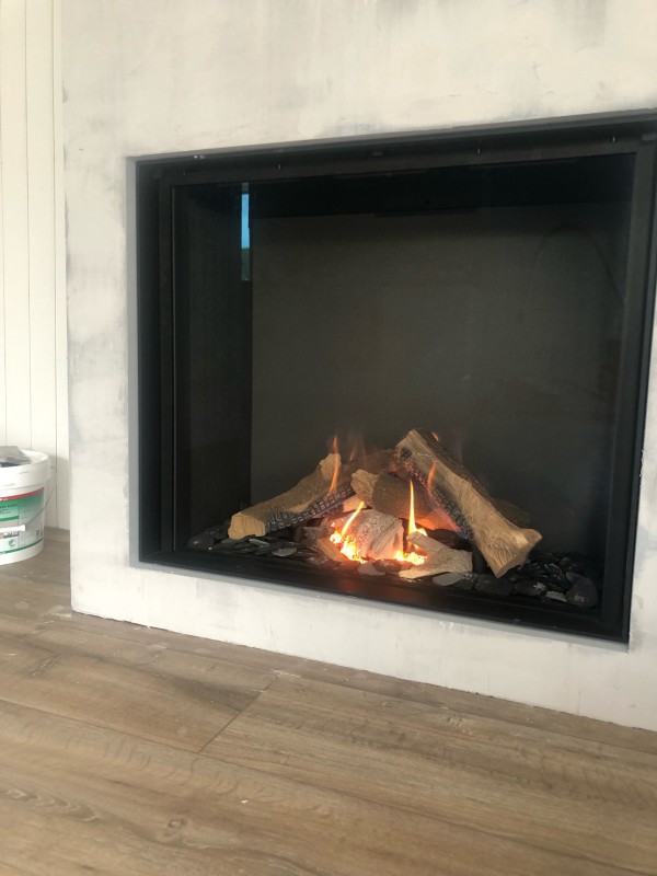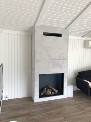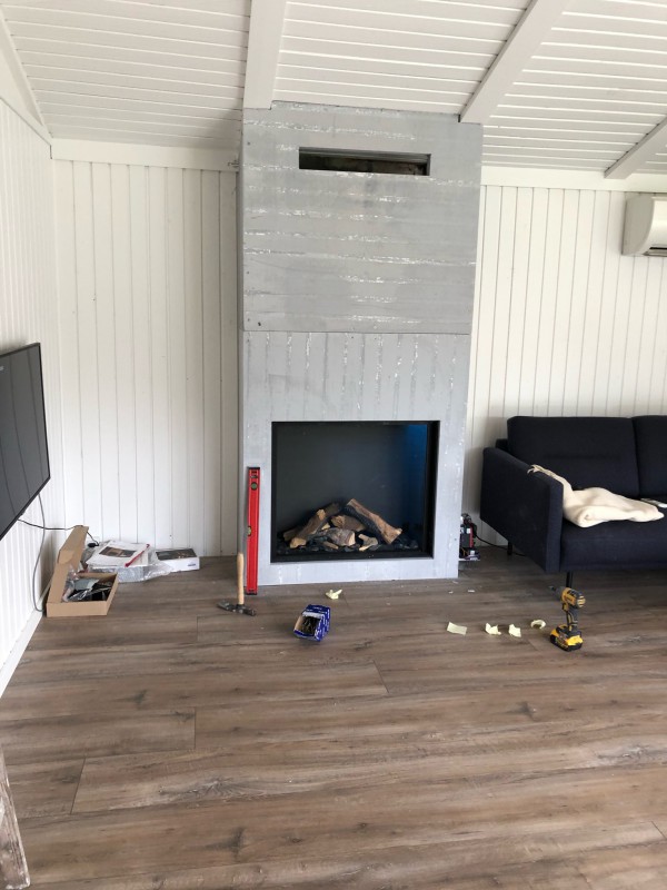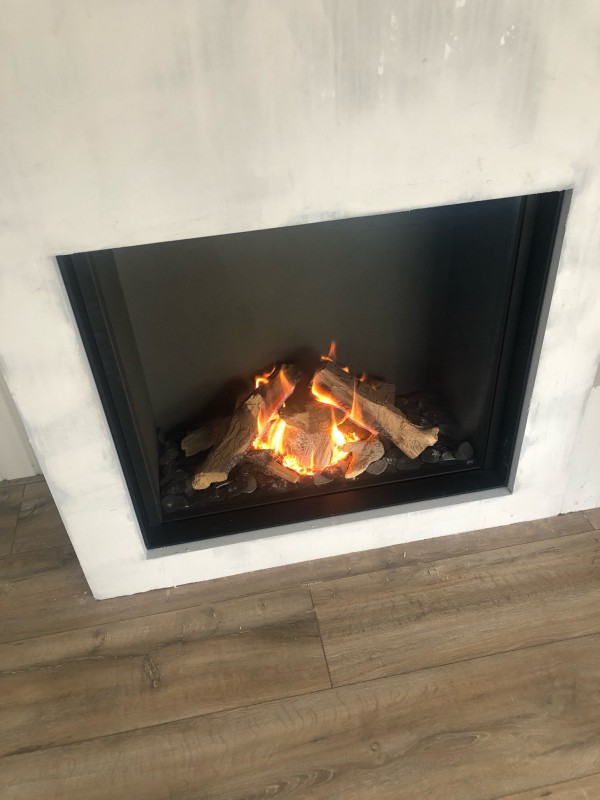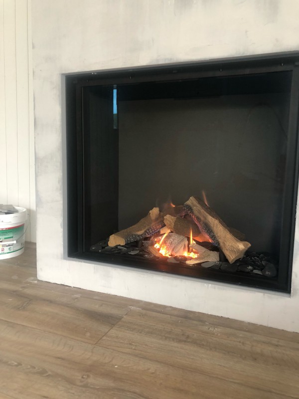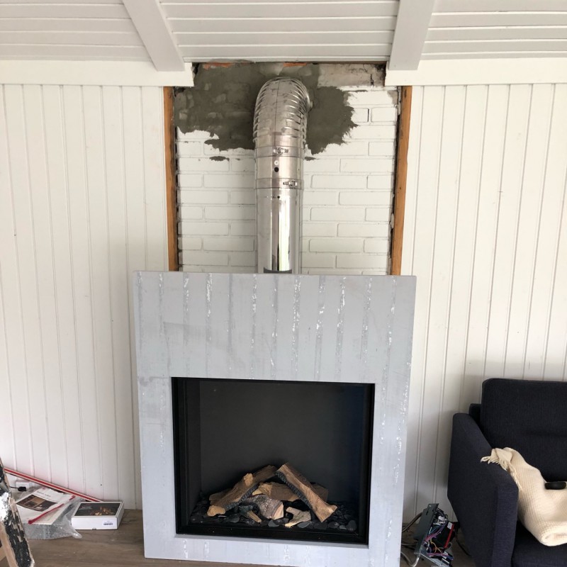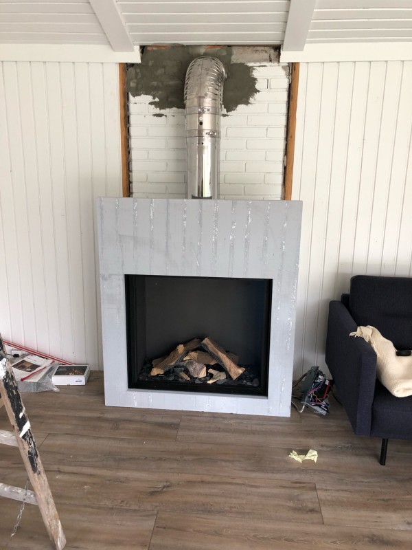 I billedserien nedenfor er installeret en Dru Maestro gaspejs i en eksisterende skorsten. Pejsen er først bygget op med Skamotec plader - under, over og på siderne. Styringen er tilsluttet i den ene side i bunden.